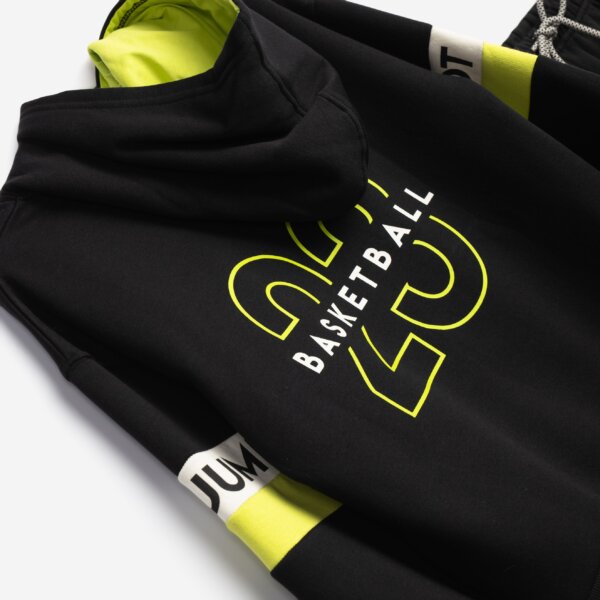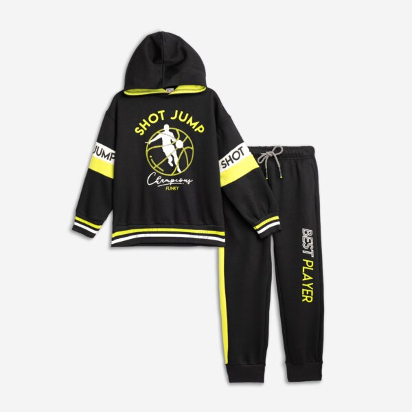 Παιδική φόρμα φούτερ for Funky kids για αγόρι από 6 έως 16 ετών. Μπλούζα σε χρώμα μαύρο-λάιμ-εκρού με κουκούλα και τύπωμα μπροστά και στην πλάτη. Παντελόνι σε χρώμα μαύρο-λάιμ-εκρού και τύπωμα.