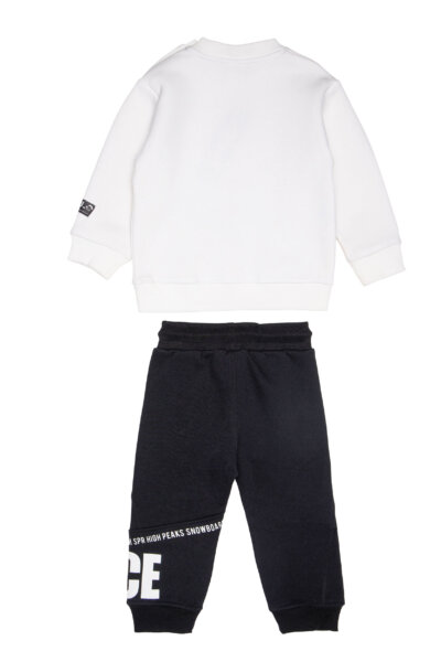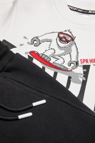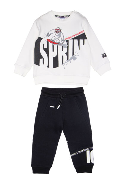 Παιδικό σετ φόρμας Sprint για αγόρι από 1 έως 6 ετών σε λευκό χρώμα με allover τύπωμα και μαύρο παντελόνι.