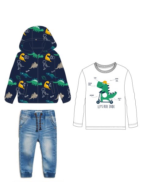 Παιδικό σετ 3 τμχ τζάκετ for Funky Kids για αγόρι από 2 έως 6 ετών. Τζάκετ σε μπλε χρώμα, μπλούζα σε εκρού χρώμα με τύπωμα και μπλε τζιν παντελόνι.