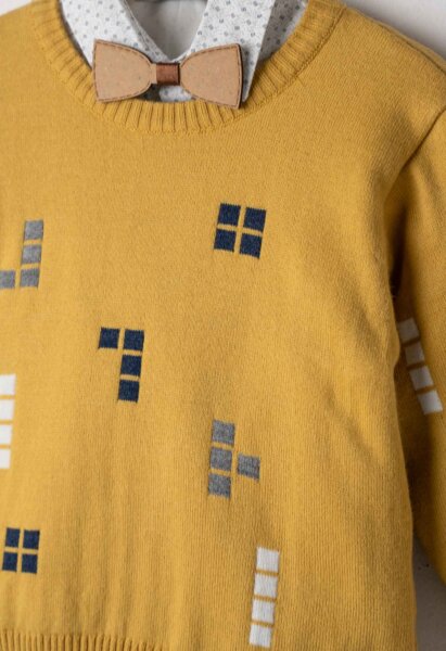 Παιδικό σετ 3τμχ Hashtag για αγόρι από 1 έως 6 ετών. Πουκάμισο σε λευκό χρώμα με διακριτικό micro-print και ξύλινο παπιγιόν. Μπλούζα πλεκτή σε κίτρινο χρώμα με γεωμετρικό μοτίβο. Παντελόνι σε μπλε χρώμα με ενσωματωμένες τιράντες.