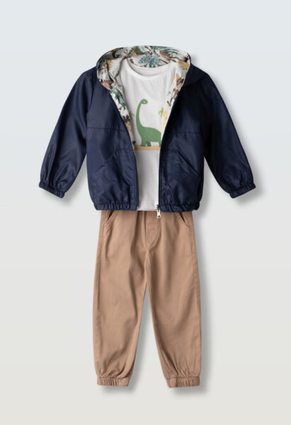 Παιδικό σετ 3τμχ Hashtag για αγόρι από 1 έως 6 ετών. Μπλε αντιανεμικό μπουφάν διπλής όψης με λευκή μπλούζα και μπεζ παντελόνι.