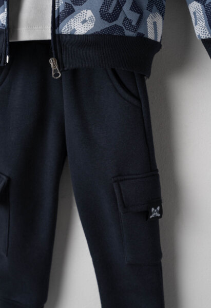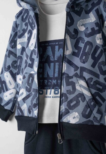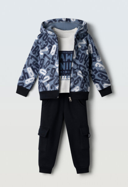 Παιδικό σετ 3τμχ Hashtag για αγόρι από 2 έως 6 ετών. Ζακέτα φούτερ με κουκούλα και φερμουάρ σε μπλε χρώμα με τύπωμα αριθμών. Μπλούζα μακρυμάνικη σε λευκό χρώμα με τύπωμα. Παντελόνι φούτερ σε μαύρο χρώμα με τσέπες στα πλάγια και λάστιχο στη μέση και στους αστραγάλους.