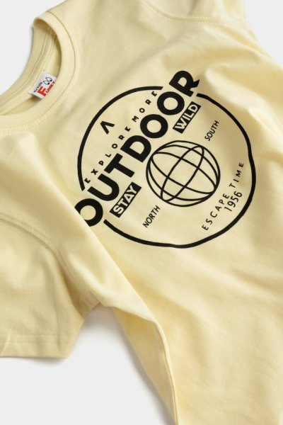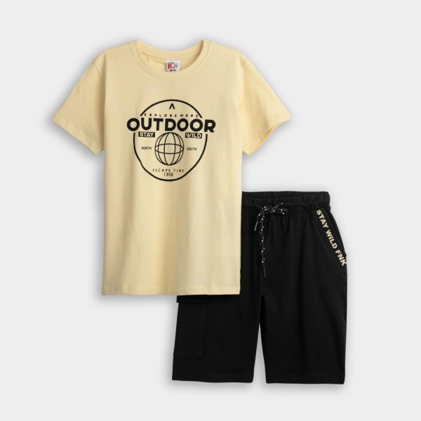 Παιδικό σετ μακό for Funky Kids για αγόρι από 6 έως 16 ετών. Μπλούζα σε κίτρινο χρώμα με τύπωμα μπροστά, βερμούδα σε μαύρο χρώμα με λάστιχο και κορδόνι στη μέση και τσέπες.