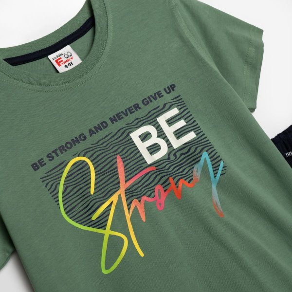 Παιδικό σετ μακό for Funky Kids για αγόρι από 6 έως 16 ετών. Μπλούζα σε λαδί χρώμα με τύπωμα, βερμούδα σε μπλε χρώμα.