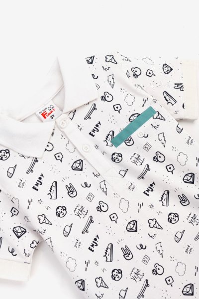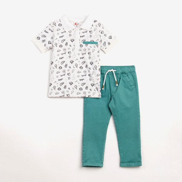 Παιδικό σετ παντελόνι for Funky Kids για αγόρι από 1 έως 6 ετών. Μπλούζα πόλο σε λευκό χρώμα με allover τύπωμα και βεραμάν σταθερό παντελόνι λύκρα.