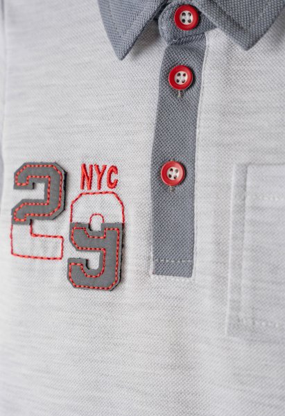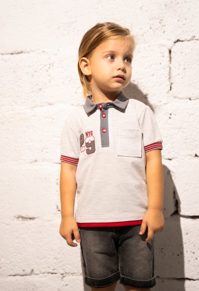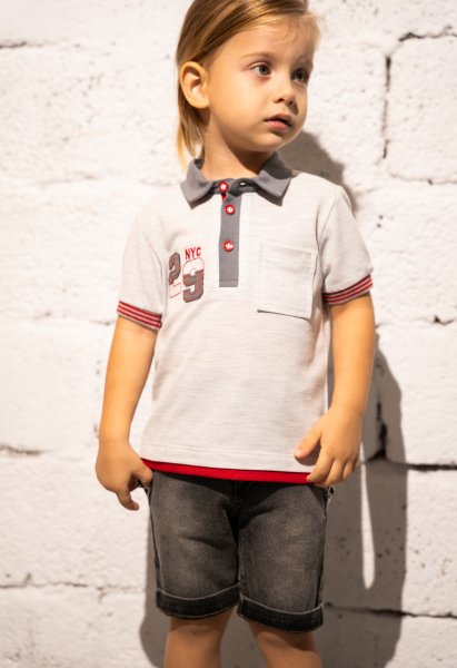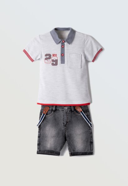 Παιδικό σετ τζιν βερμούδα Hashtag για αγόρι από 1 έως 6 ετών. Μπλούζα πόλο σε λευκό-γκρι χρώμα με τύπωμα και μαύρη τζιν βερμούδα.