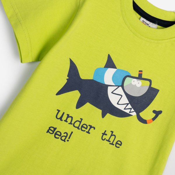 Παιδικό σετ βερμούδα for Funky Kids για αγόρι από 2 έως 6 ετών. Μπλούζα σε λαχανί χρώμα με τύπωμα και μπλε βερμούδα.