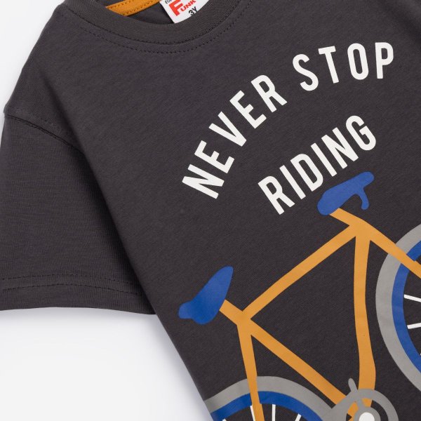 Παιδικό σετ μακό for Funky Kids για αγόρι από 2 έως 6 ετών. Μπλούζα σε ανθρακί χρώμα με τύπωμα και πορτοκαλί βερμούδα με allover τύπωμα.