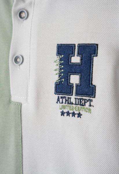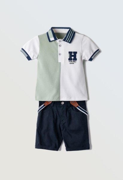 Παιδικό σετ βερμούδα Hashtag για αγόρι από 1 έως 6 ετών. Μπλούζα πόλο σε μέντα-λευκό χρώμα με τύπωμα και μπλε βερμούδα.