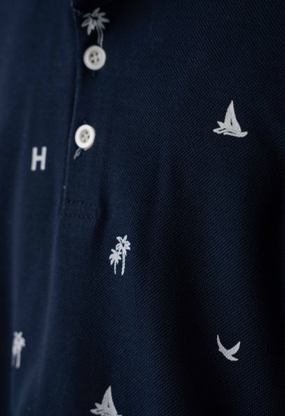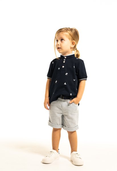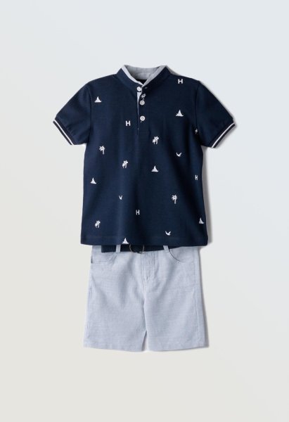 Παιδικό σετ βερμούδα Hashtag για αγόρι από 1 έως 6 ετών. Μπλούζα πόλο σε μπλε χρώμα με τύπωμα και ριγέ σιέλ βερμούδα.