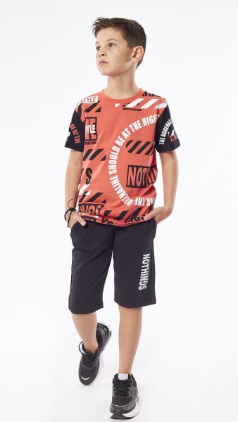 Παιδικό Σετ βερμούδα Hashtag για αγόρι από 6 έως 16 ετών. Μπλούζα σε κοραλλί χρώμα με τύπωμα και μαύρη βερμούδα.