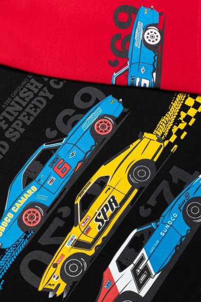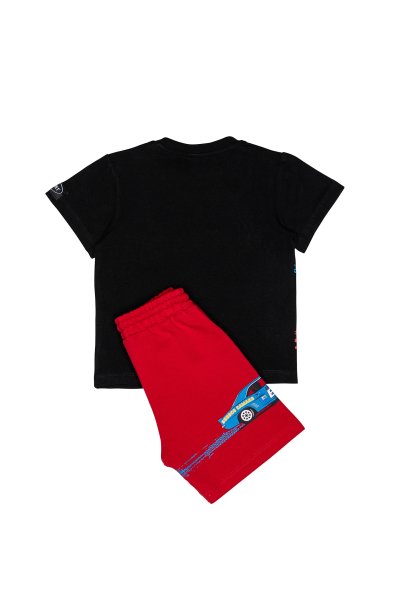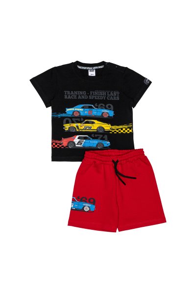 Παιδικό σετ βερμούδα Sprint για αγόρι από 18 μηνών έως 6 ετών. Μπλούζα σε μαύρο χρώμα με τύπωμα και βερμούδα σε κόκκινο χρώμα.