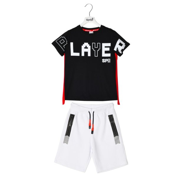 Παιδικό σετ βερμούδα Sprint για αγόρι από 6 έως 16 ετών. Μπλούζα σε μαύρο χρώμα με τύπωμα και βερμούδα σε λευκό χρώμα.