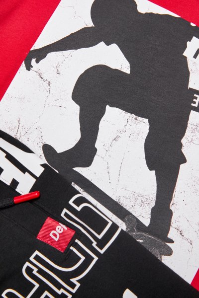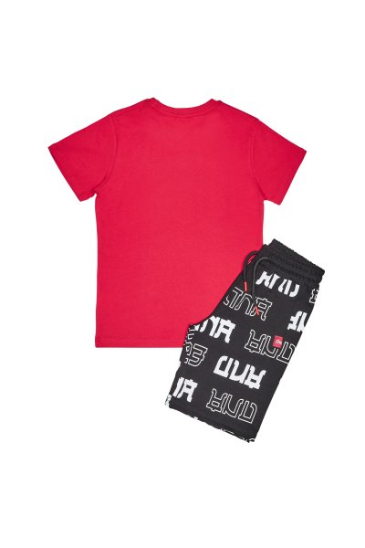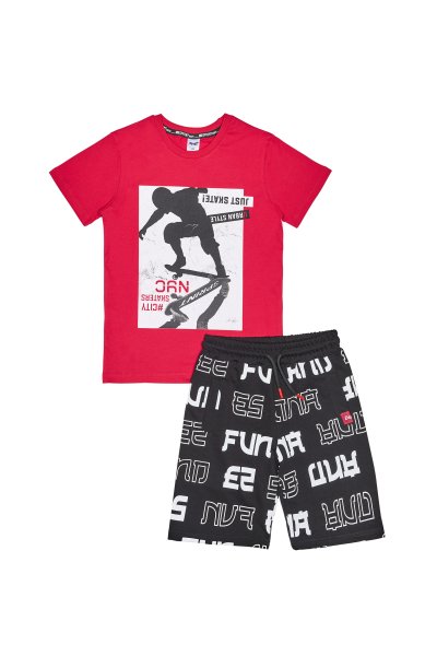 Παιδικό σετ βερμούδα Sprint για αγόρι από 6 έως 16 ετών. Μπλούζα σε κόκκινο χρώμα με τύπωμα και βερμούδα σε μαύρο χρώμα με ολόσωμο τύπωμα.