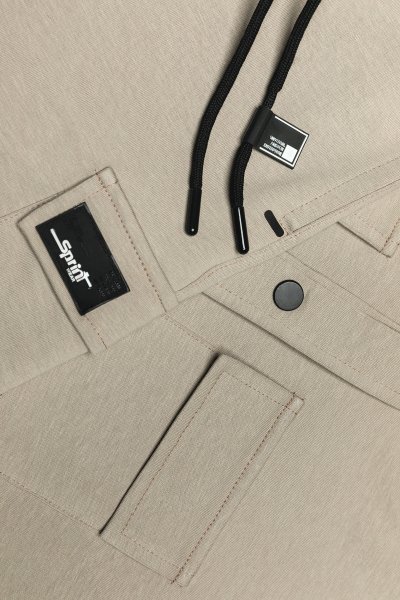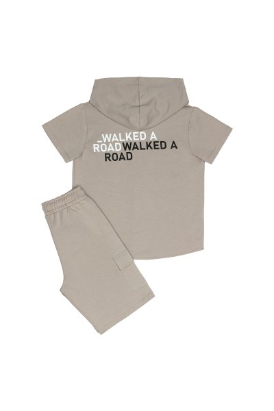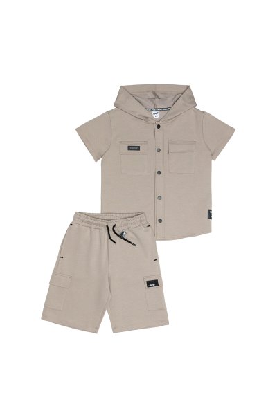 Παιδικό σετ βερμούδα Sprint για αγόρι από 7 έως 16 ετών. Πουκάμισο με κουκούλα σε μπεζ χρώμα με τύπωμα και μπεζ βερμούδα.