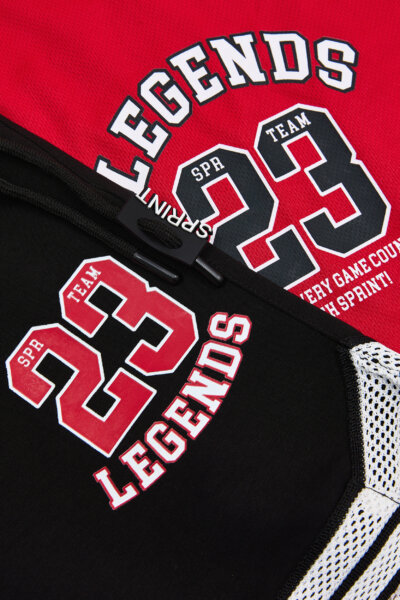 Παιδικό σετ βερμούδα Sprint για αγόρι από 7 έως 16 ετών. Μπλούζα αμάνικη σε κόκκινο χρώμα με τύπωμα και μαύρη βερμούδα.