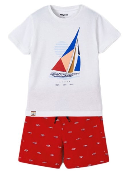 Σετ παντελόνι κοντό σταμπωτό και μπλούζα Mayoral για αγόρι από 2 έως 9 χρονών σε λευκό – κόκκινο χρώμα.