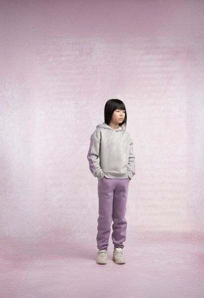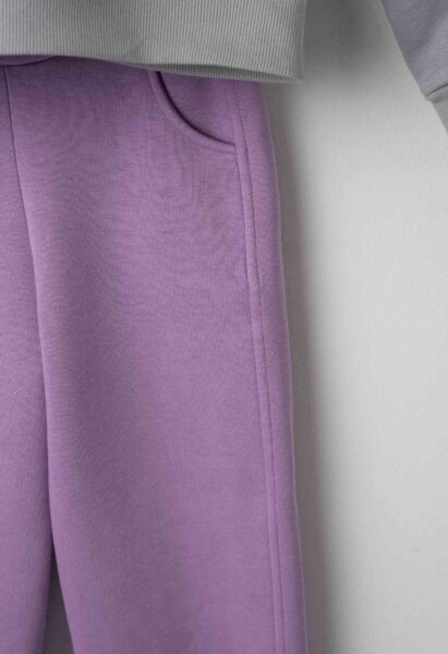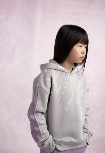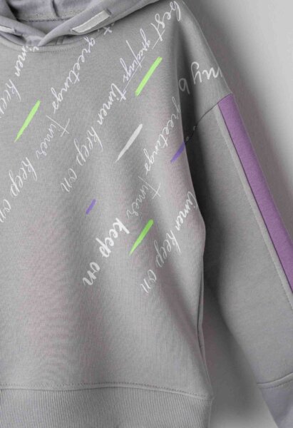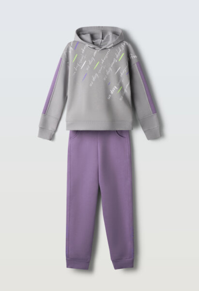 Παιδικό σετ φόρμας Εβίτα για κορίτσι από 6 έως 16 ετών. Μπλούζα με κουκούλα, τύπωμα και λεπτομέρειες στα μανίκια σε γκρι χρώμα. Παντελόνι φούτερ με λάστιχο στη μέση και στο τελείωμα σε μωβ χρώμα.