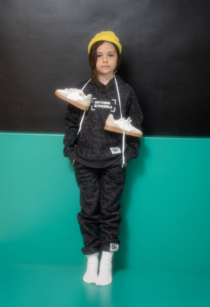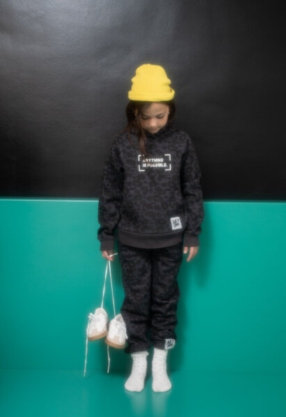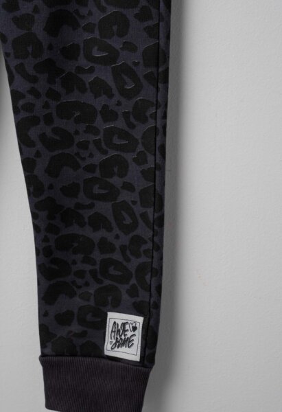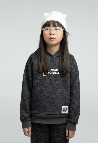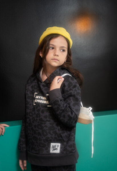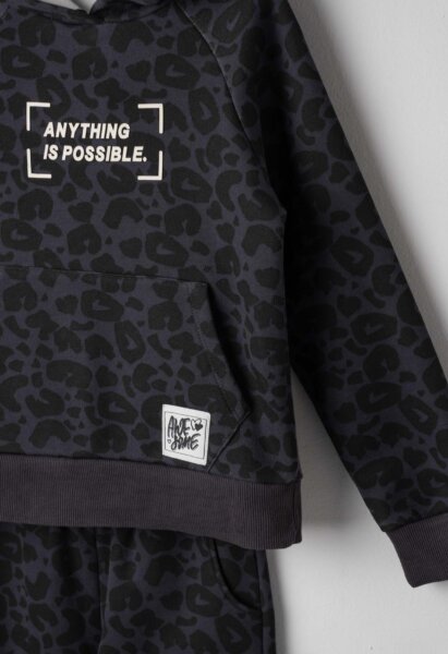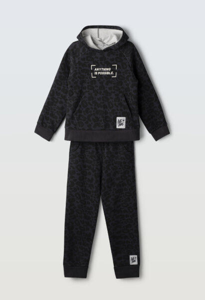 Παιδικό σετ φόρμας Εβίτα για κορίτσι από 6 έως 16 ετών. Μπλούζα φούτερ με κουκούλα και παντελόνι φούτερ με allover λεοπάρ τύπωμα σε μαύρο χρώμα.