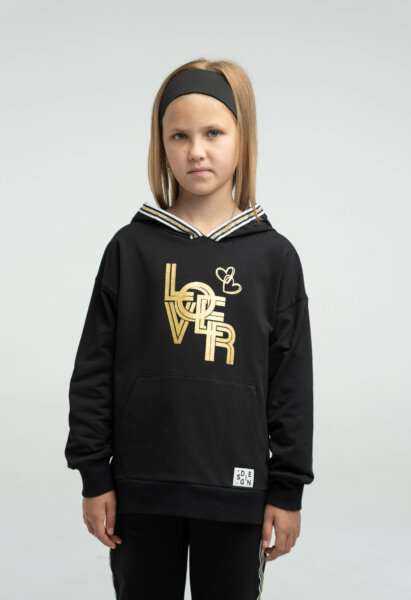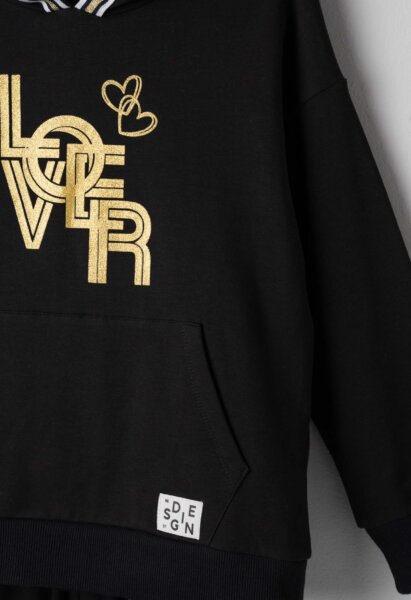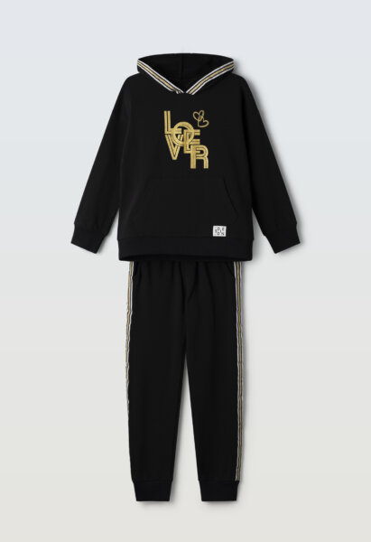 Παιδικό σετ φόρμας Εβίτα για κορίτσι από 6 έως 16 ετών σε μαύρο χρώμα. Μπλούζα φούτερ με κουκούλα και τύπωμα. Παντελόνι φούτερ με λάστιχο στη μέση και στο τελείωμα, διακοσμητικές λωρίδες στο πλάι.