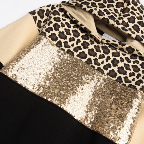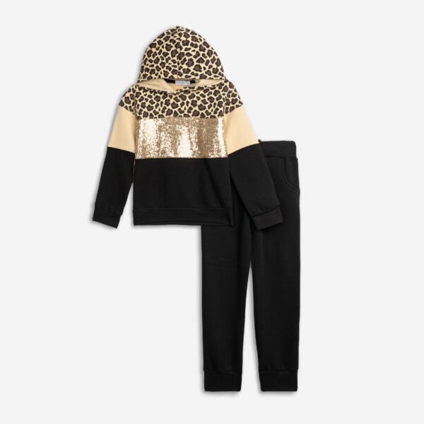 Παιδικό σετ φόρμας for Funky kids για κορίτσι από 6 έως 16 ετών. Μπλούζα φούτερ με κουκούλα και τυπωμα και παγιέτα σε μπεζ χρώμα και μαύρο παντελόνι φόρμας.