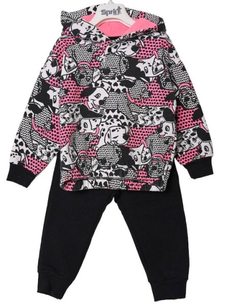 Παιδικό σετ φόρμας Sprint για κορίτσι από 12 μηνών έως 5 ετών. Φούτερ με σχέδια σκυλάκια Δαλματίας και μαύρο παντελόνι.