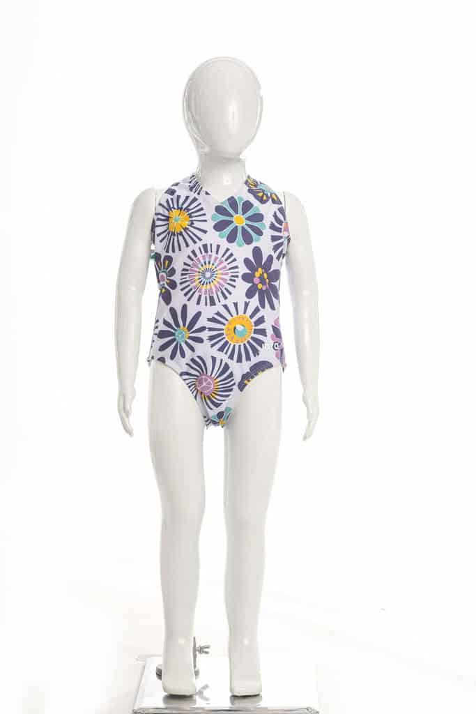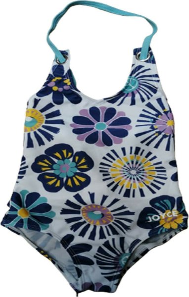 Παιδικό Μαγιό Ολόσωμο Joyce για κορίτσι από 1 έως 5 ετών σε λευκό χρώμα με allover τύπωμα από ελαστικό ύφασμα για εύκολη εφαρμογή.