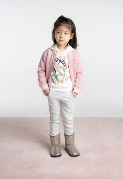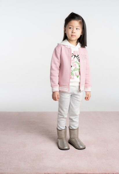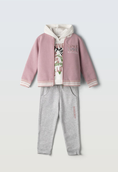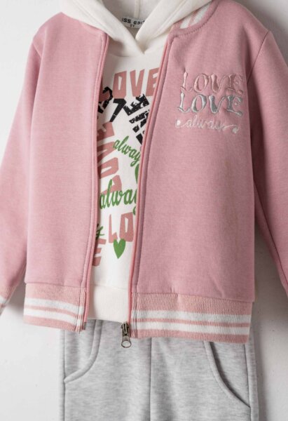 Παιδικό σετ 3 τμχ ΕΒΙΤΑ για κορίτσι από 2 έως 6 ετών. Ζακέτα φούτερ με τύπωμα σε ροζ χρώμα. Μπλούζα με κουκούλα και τύπωμα. Παντελόνι φούτερ σε γκρι χρώμα.