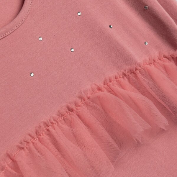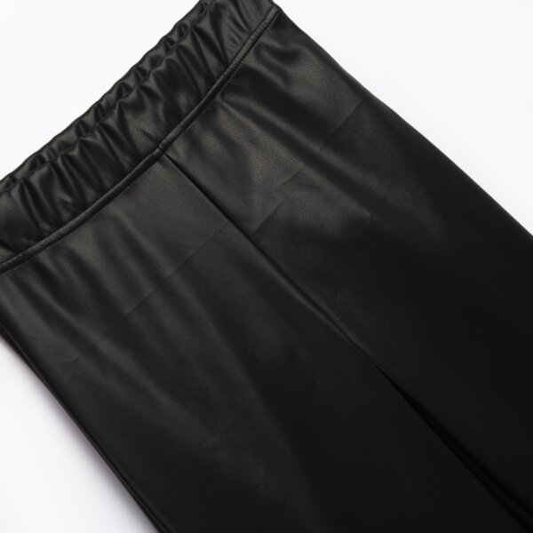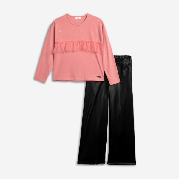 Παιδικό σετ for Funky kids για κορίτσι από 6 έως 16 ετών. Μπλούζα με στρας και βολάν σε ροζ χρώμα και παντελόνα δερμάτινη σε μαύρο χρώμα.