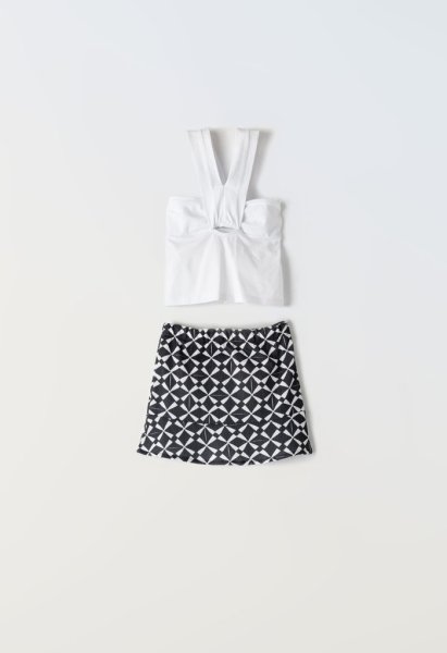 Παιδικό Σετ φούστα Εβίτα για κορίτσι από 6 έως 16 ετών. Μπλούζα crop σε μαύρο χρώμα και μαύρη φούστα με allover λευκό τύπωμα.
