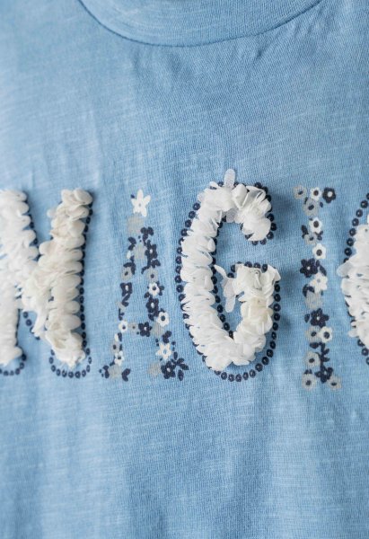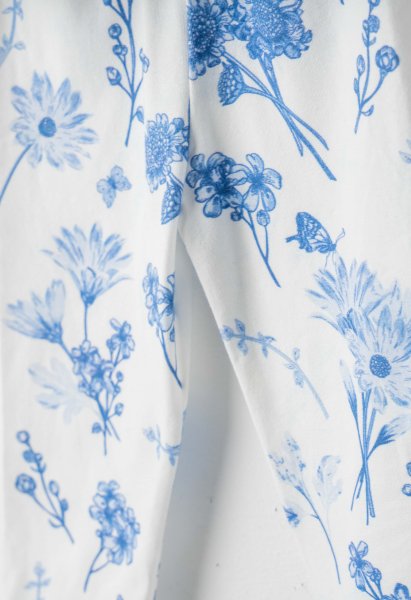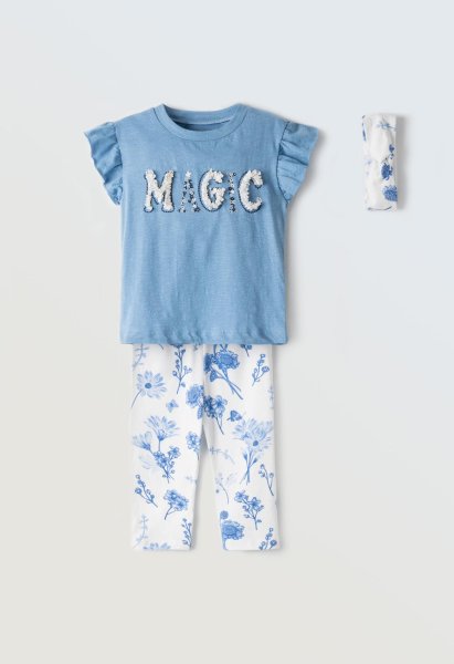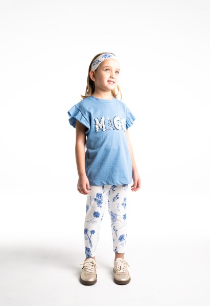 Παιδικό σετ κολάν ΕΒΙΤΑ για κορίτσι από 1 έως 6 ετών. Μπλούζα σε μπλε χρώμα με τύπωμα, κολάν σε εκρού χρώμα με allover τύπωμα και κορδέλα.
