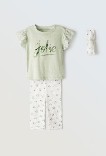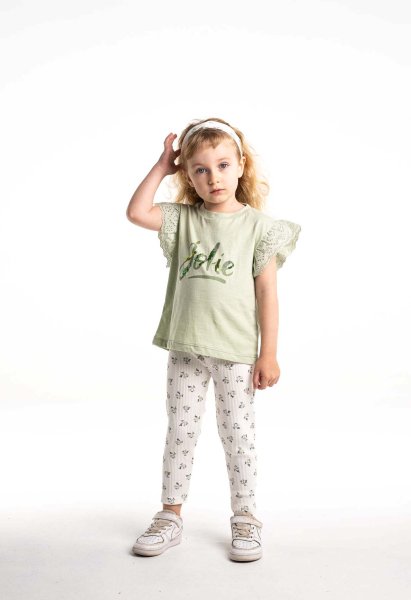 Παιδικό σετ κολάν ΕΒΙΤΑ για κορίτσι από 1 έως 6 ετών. Μπλούζα σε μέντα χρώμα, κολάν σε εκρού χρώμα με allover τύπωμα και κορδέλα.
