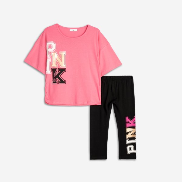 Παιδικό σετ κολάν κάπρι for Funky Kids για κορίτσι από 6 έως 16 ετών. Μπλούζα σε ροζ χρώμα με τύπωμα και μαύρο κολάν με τύπωμα.
