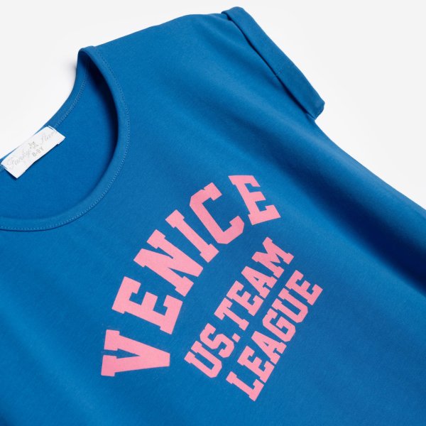Παιδικό σετ κολάν κάπρι for Funky Kids για κορίτσι από 6 έως 16 ετών. Μπλούζα σε μπλε χρώμα με τύπωμα και μπλε κολάν με allover τύπωμα.