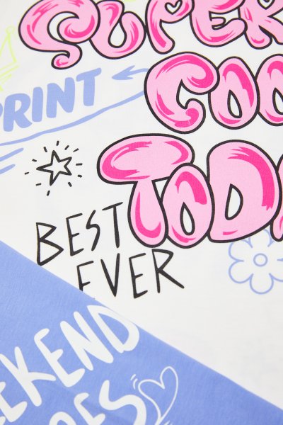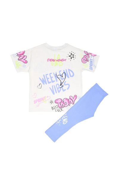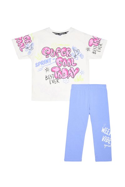 Παιδικό σετ κολάν Sprint για κορίτσι από 6 έως 16 ετών. Μπλούζα σε λευκό χρώμα με τύπωμα και κολάν σε μωβ χρώμα με τύπωμα.