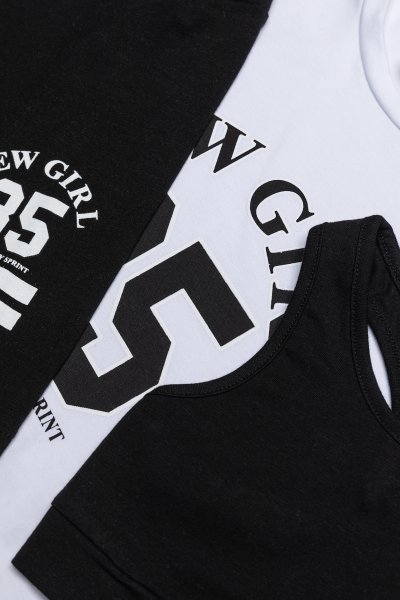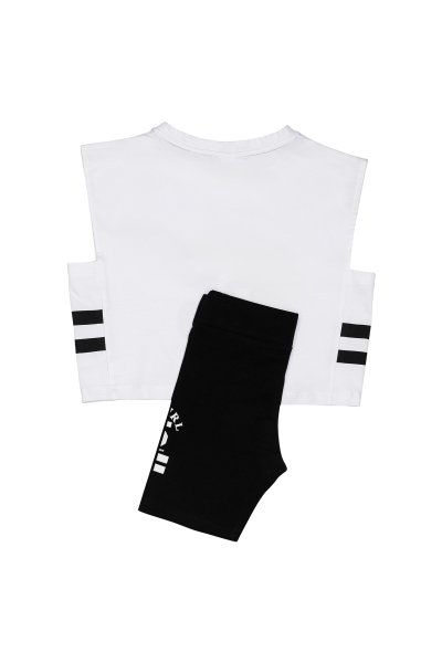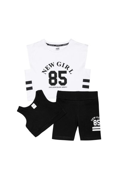 Παιδικό σετ κολάν Sprint για κορίτσι από 7 έως 16 ετών. Crop αμάνικη μπλούζα σε λευκό χρώμα με τύπωμα, αμάνικο μπουστάκι μαύρο και μαύρο ποδηλατικό κολάν.