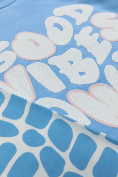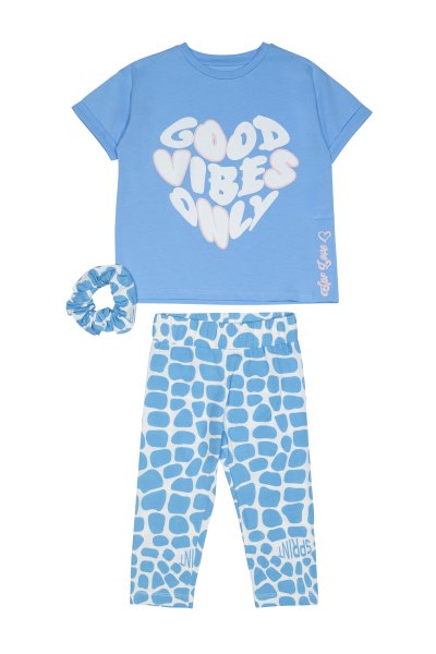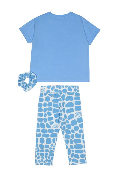 Παιδικό σετ κολάν Sprint για κορίτσι από 7 έως 16 ετών. Μπλούζα σε γαλάζιο χρώμα με τύπωμα και γαλάζιο κολάν με allover λευκό τύπωμα. Στο σετ περιλαμβάνεται scrunchie λαστιχάκι.