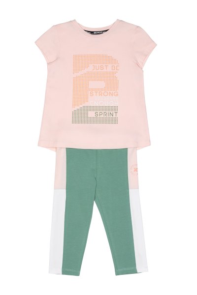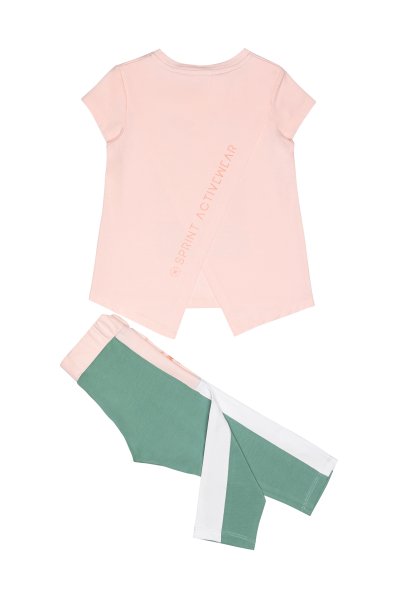 Παιδικό σετ κολάν Sprint για κορίτσι από 7 έως 16 ετών. Μπλούζα σε ροζ χρώμα με τύπωμα και πράσινο-ροζ-λευκό κολάν.