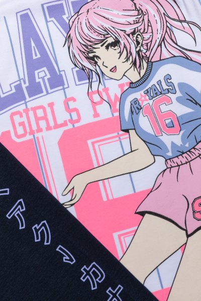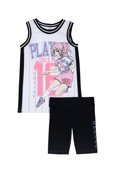 Παιδικό σετ κολάν Sprint για κορίτσι από 7 έως 16 ετών. Αμάνικη μπλούζα σε λευκό χρώμα με τύπωμα anime και μαύρο ποδηλατικό κολάν.