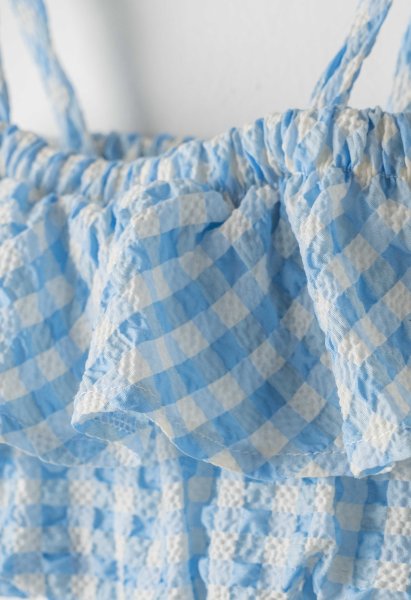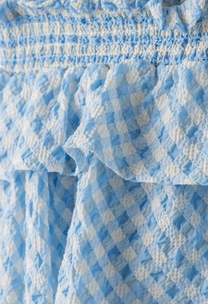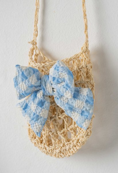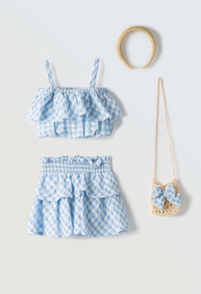 Παιδικό σετ φούστα ΕΒΙΤΑ για κορίτσι από 1 έως 6 ετών σε γαλάζιο χρώμα με allover καρό τύπωμα, τσάντα και στέκα.