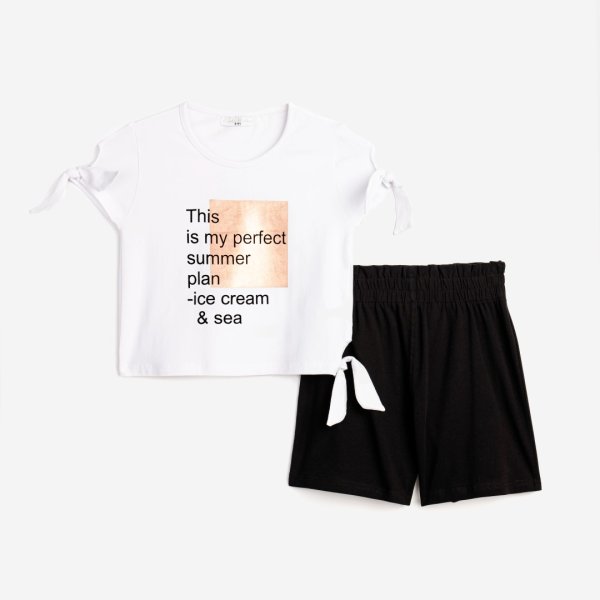 Παιδικό σετ σορτς for Funky Kids για κορίτσι από 6 έως 16 ετών. Μπλούζα σε λευκό χρώμα με τύπωμα και δέσιμο στα μανίκια, βερμούδα σε μαύρο χρώμα με λάστιχο στη μέση.