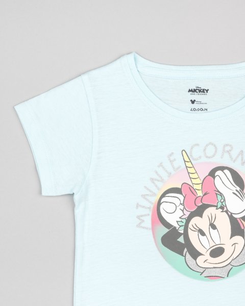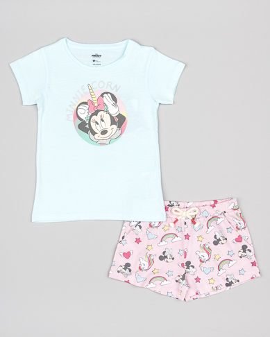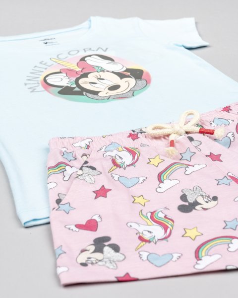 Παιδικό σετ σορτς Losan για κορίτσι από 2 έως 7 ετών. Μπλούζα σε γαλάζιο χρώμα με τύπωμα ‘Minnie’ και σορτς σε ροζ χρώμα με ολόσωμο τύπωμα ‘Minnie’.