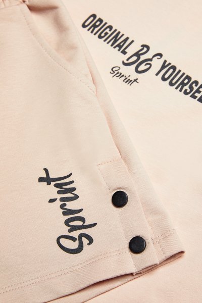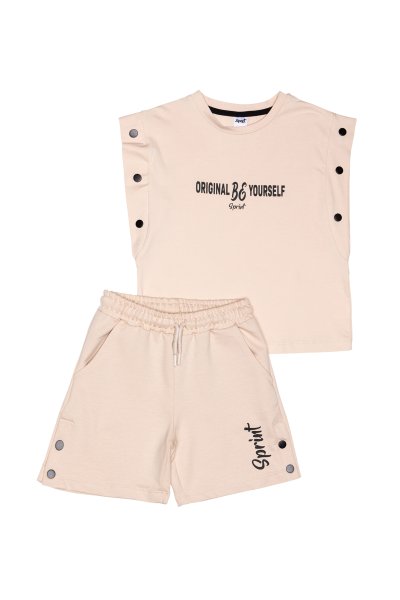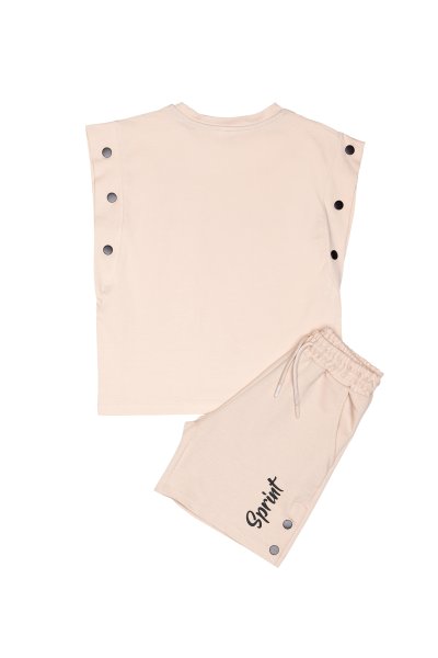 Παιδικό σετ σορτς Sprint για κορίτσι από 6 έως 16 ετών. Μπλούζα σε μπεζ χρώμα με τύπωμα και σορτς σε μπεζ χρώμα με τύπωμα.