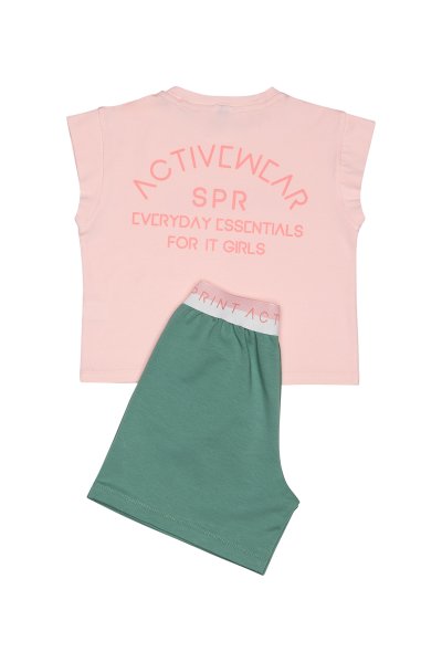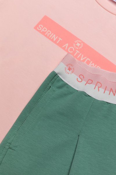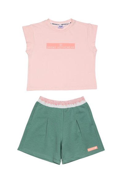 Παιδικό σετ σορτς Sprint για κορίτσι από 7 έως 16 ετών. Μπλούζα σε ροζ χρώμα με τύπωμα και πράσινο σορτς.
