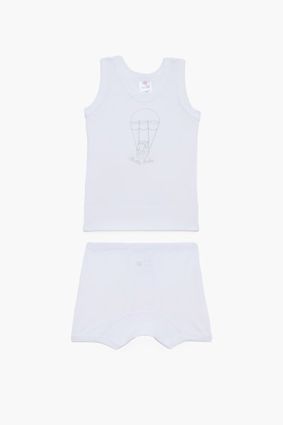 Βαφτιστικό σετ Pretty Baby για αγόρια το οποίο περιλαμβάνει ένα αμάνικο φανελάκι και ένα μποξεράκι σε λευκό χρώμα. Διαθέτει διακριτικό τύπωμα αερόστατο στο στήθος. Κατασκευάζεται από 100% πενιέ βαμβάκι που επιτρέπει στο σώμα να αναπνέει.
