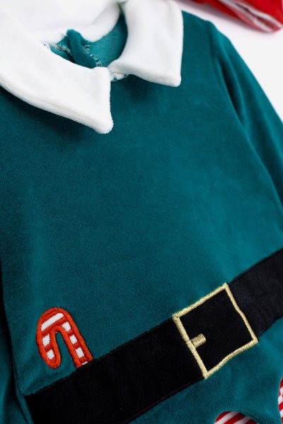 Βρεφικό Χριστουγεννιάτικο φορμάκι βελουτέ ξωτικό με σκουφί for Funky kids για αγόρι από 1 έως 9 μηνών σε πράσινο-εκρού-κόκκινο χρώμα με τύπωμα.