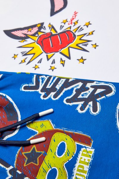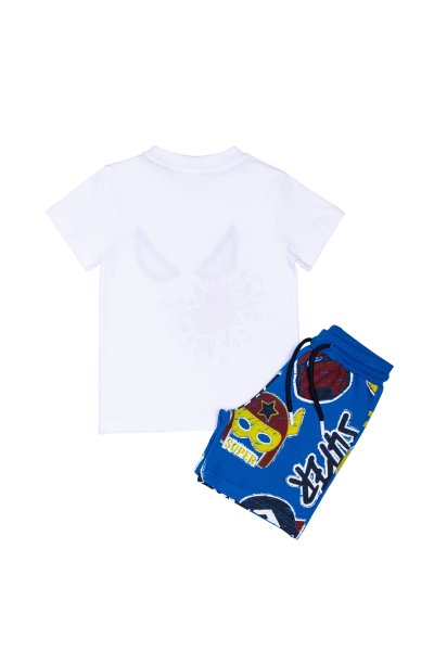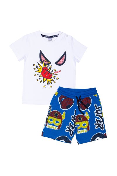 Παιδικό σετ βερμούδα Sprint για αγόρι από 12 μηνών έως 5 ετών. Μπλούζα με τύπωμα σε λευκό χρώμα, βερμούδα σε μπλε χρώμα με ολόσωμο τύπωμα.