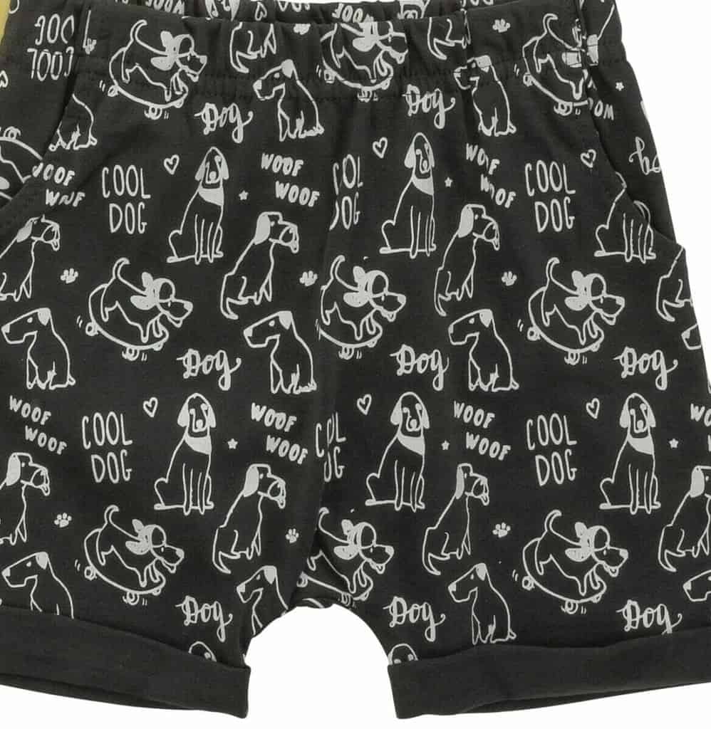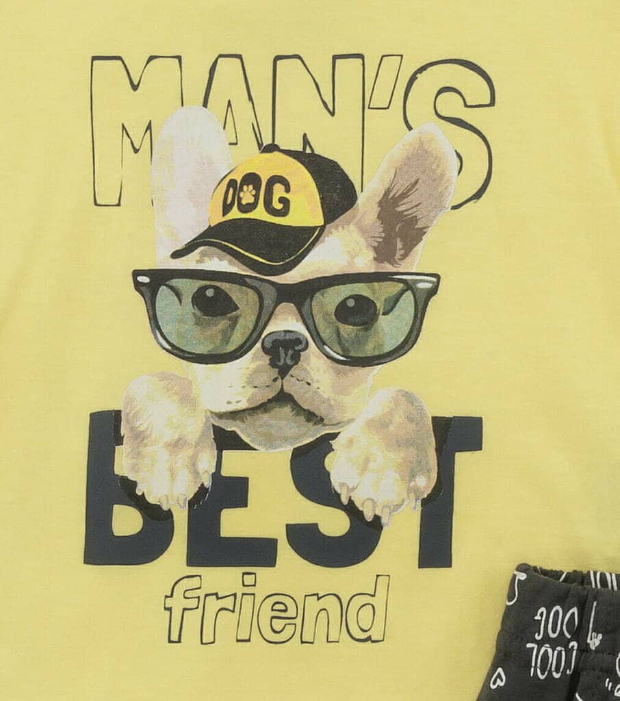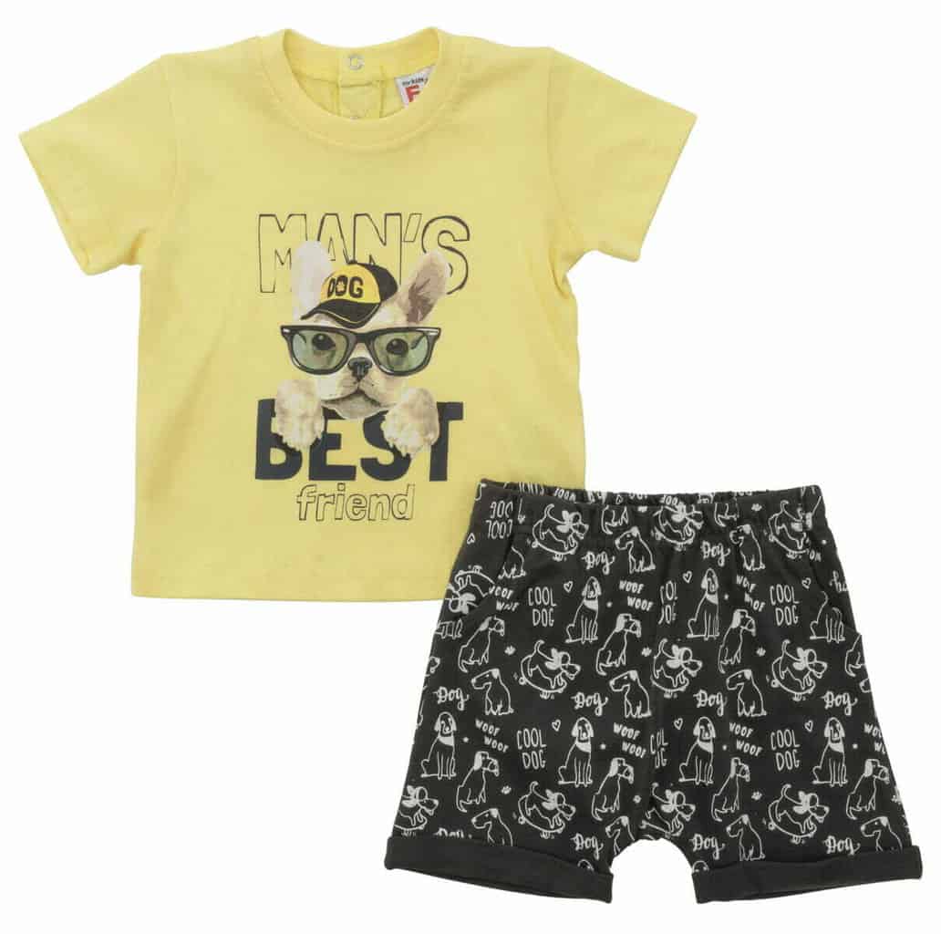 Μπλούζα σε χρώμα κίτρινο με τύπωμα και βερμούδα σε ανθρακί χρώμα με ολόσωμο τύπωμα.