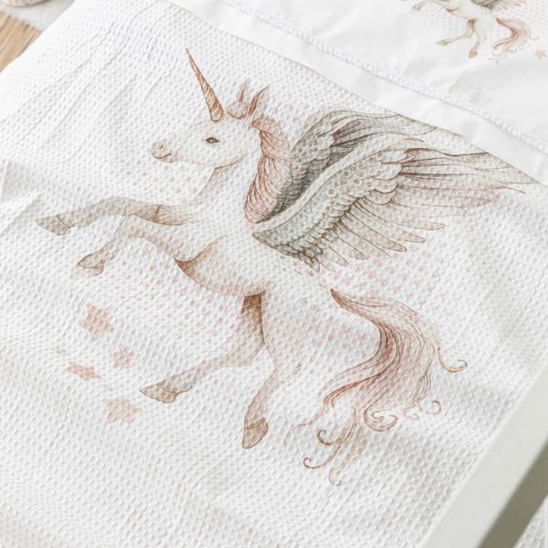 Κουβέρτα κούνιας από ύφασμα πικέ waffle, 100% βαμβακερό, λευκό, με ροζέ ρέλι περιμετρικά και ψηφιακή εκτύπωση, σχέδιο μονόκερος.