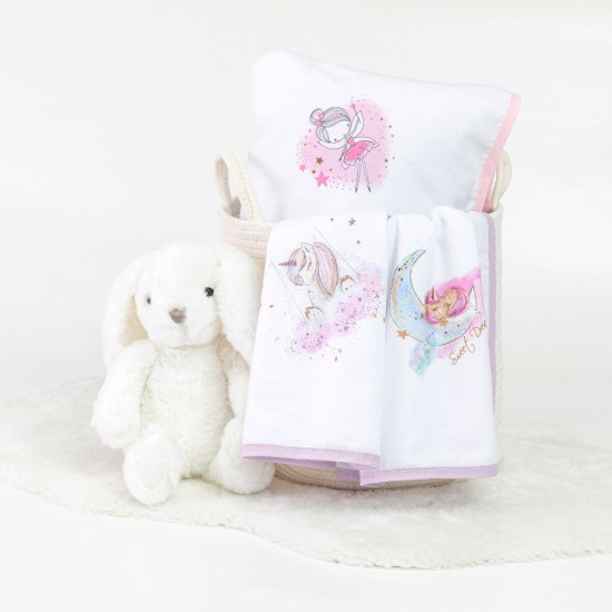 Πάνα αγκαλιάς 100% βαμβακερό, λευκό με ροζ ρέλι περιμετρικά και ψηφιακή εκτύπωση τριών σχεδίων για κορίτσι.